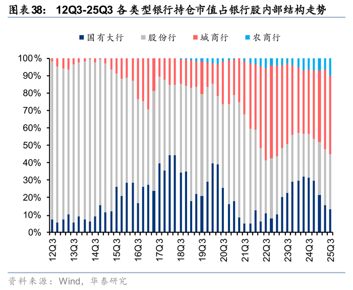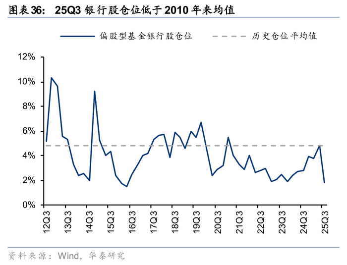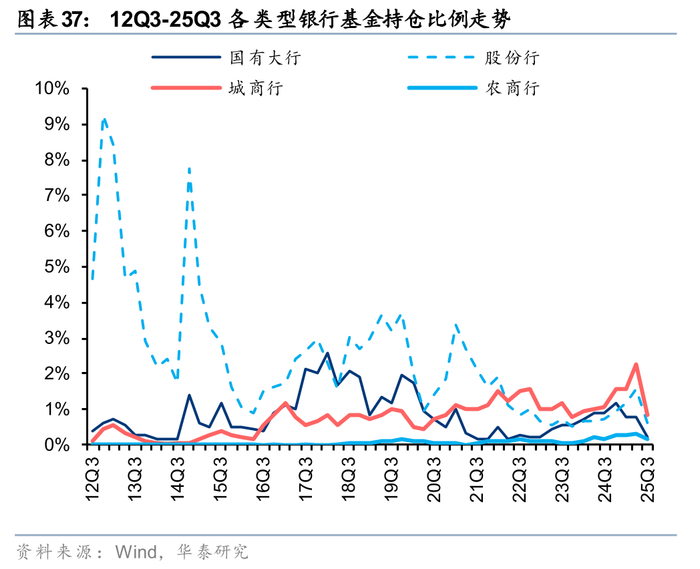 三季度在市场风格切换影响下,公募基金所持银行仓位环比下行,降幅为15Q2以来最高。三季度在成长板块带动下,市场风险偏好显著回暖,银行股面临较大的资金流失压力。偏股型基金仓位环比下滑显著,各类型银行仓位均下行,城商行、股份行尤其明显。25Q3银行股占偏股型基金仓位为1.85%,较25Q2下降3.02pct,边际下滑幅度为15Q2以来最高,大行、股份行、城商行、农商行仓位分别环比-0.52pct、-0.97pct、-1.41pct、-0.12pct至0.25%、0.59%、0.83%、0.18%。从个股持仓看,37只重仓股中30家被减持,招行、江苏、杭州、农行等被减持较多。