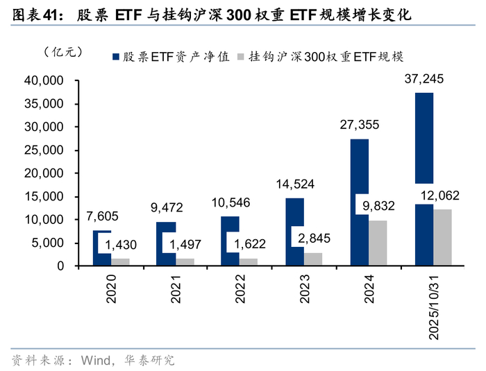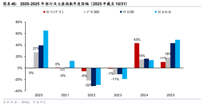 银行板块权重占比较高,有望受益于ETF扩容。截至25年10月末,3.72万亿元的ETF市场中,宽基产品(规模指数型)达2.47万亿元,占比66%,相较24年末提升7pct,是本轮ETF增长的核心力量。以沪深300为例,2025年10月末挂钩沪深300权重的ETF规模较24年底增长2230亿元至12062亿元,增量占2025年股票ETF资产净值规模的23%。而银行板块在沪深300等核心指数中权重占比较高,为13.7%,有望受益于被动资金持续扩容。