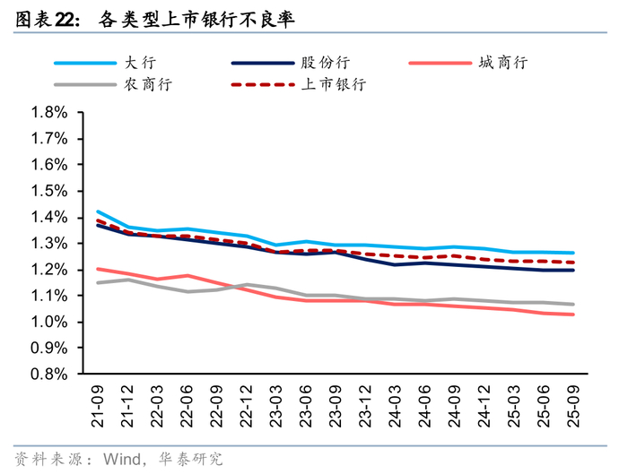 预计银行账面不良率保持稳定,关注小微、零售风险拐点。25Q3末上市银行不良率、拨备覆盖率1.26%、235%,较6月末持平、-2pct,账面不良率表现较为稳定,拨备覆盖率略有下行但仍位于较为充足水平,反哺利润仍有一定空间。随地产、化债政策持续加码,银行对公端风险担忧整体缓释,不良率稳步改善。25H1末上市银行对公贷款不良率较24A末-10bp至1.29%,对公贷款资产质量稳中向好。但经济逐步修复进程中,消费者信心指数仍处低位,需关注零售、小微风险变化,预计不良生成高位逐步企稳,但是否出现拐点仍待观察。2025H1末上市银行零售贷款不良率较24A末提升2bp至1.23%,零售贷款不良率仍呈现提升趋势,但不良率上行斜率趋缓。
