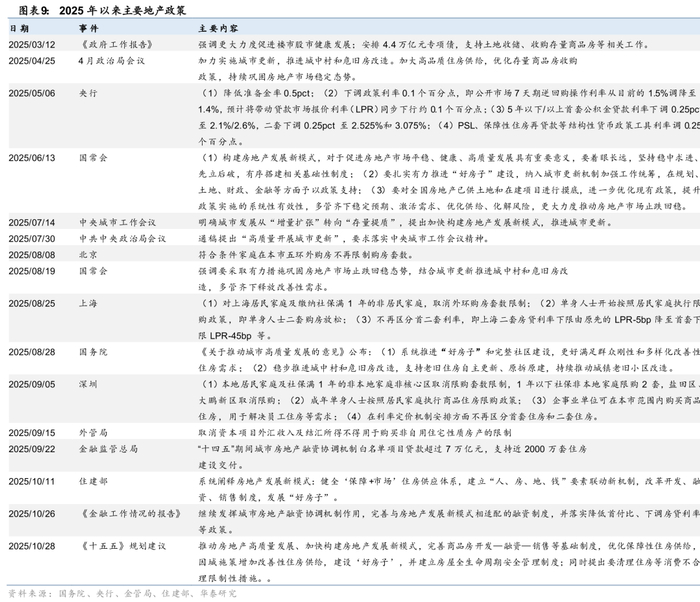 地产政策重点从单纯需求端刺激转向供给—要素—制度的系统性重塑。2025年7月中央城市工作会议明确城市发展由“增量扩张”转向“存量提质”,将“以推进城市更新为重要抓手”上升为总要求;7月政治局会议提出“高质量开展城市更新”,要求落实城市工作会议精神;政府工作报告提出“更大力度促进楼市股市健康发展”,并以专项债支持土地收储和收购存量商品房,疏通资金与去化链条。8月国常会“更大力度”止跌回稳表态之后,政策基调无新增变化。 “住建部在10月国新办发布会上强调完善“保障+市场”住房供应体系,建立“人、房、地、钱”要素联动机制,改革开发、融资、销售等基础性制度,稳步推进现房销售与资金监管优化,发展安全、舒适、绿色、智慧的“好房子”;在因城施策框架下,通过降低居民购房成本、盘活存量、推进城市更新,促进供需结构优化与市场企稳回稳,为银行涉房资产质量改善创造条件。
