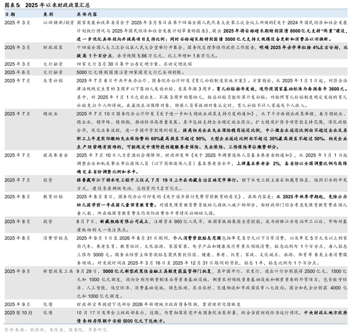 去年四季度以来财政政策力度明显加大,对稳增长、稳预期和稳市场主体现金流起到积极作用。财政支出重点向补充实体经济现金流、提振消费和民生倾斜,如多轮消费补贴、银行资本金补充、生育补贴、消费贷贴息以及新型政策性金融工具等。核心措施包括: