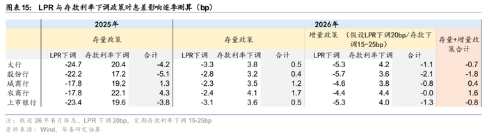 存款成本改善具有滞后性,测算存量降息政策小幅提振2026年息差。若2026年无进一步降息政策,综合考虑2023年以来的LPR与存款利率降息政策,测算存量降息政策小幅提振2026年息差。若2026年LPR进一步下调,银行存款利率亦有望跟随下行。根据Wind一致预测,假设LPR下调20bp,定期存款利率相应下降15-25bp,则测算显示对银行息差影响约为1.3bp,整体影响可控。尽管存款定期化趋势与新发放贷款利率下行仍会对息差形成一定扰动,但其影响幅度正逐步收敛。综合各项因素判断,2026年银行业整体息差降幅有望进一步收窄。其中,优质区域银行得益于资产端定价率先企稳、负债端成本改善空间较大,其息差表现有望领先行业,实现企稳并逐步回升。