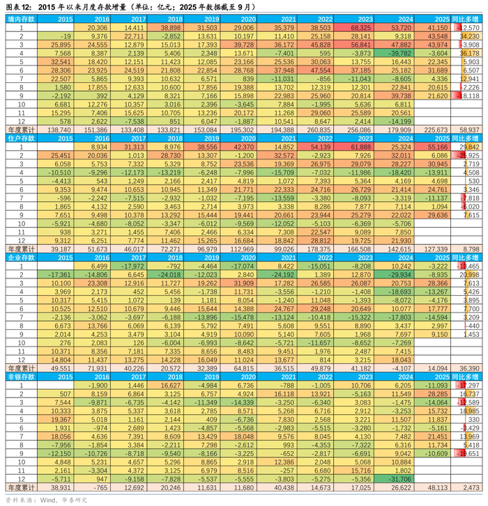 存款利率持续下调后收益性价比下降,关注存款搬家演绎趋势。近年来,在居民预防性储蓄需求上升的推动下,银行体系积累了较多存款。然而,随着银行存款挂牌利率持续下调,居民和企业存款的实际收益明显下降,存款作为资产配置的吸引力正在减弱。与此同时,监管部门对高息揽储和变相补息等违规行为的严格整治,进一步限制了银行通过价格手段稳定存款的能力。叠加今年以来资本市场的逐步回暖,存款收益的性价比相对降低,促使部分资金转向收益更具吸引力的理财、基金和资本市场产品。从宏观数据来看,今年7-8月居民存款分别同比少增7818亿元和6020亿元,而非银存款则同比多增13969亿元和5418亿元,这一结构性变化反映出银行存款增长面临一定压力,也初步显示出“存款搬家”的迹象。中长期来看,若存款利率持续处于下行通道,银行存款流失压力可能进一步加大。为应对潜在的负债缺口,银行或将持续加大主动负债力度,通过发行金融债、同业存单等方式补充资金来源,以维持流动性平稳和资产端投放能力。