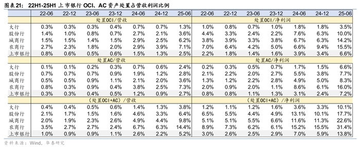 短期看银行通过浮盈兑现平滑债市波动影响,但明后年在较高基数下预计操作空间收窄。截至25H1末,上市银行OCI账户中累计浮盈规模占营收和净利润的比例分别为12%和32%,短期看银行业整体具备一定业绩平滑空间。Q3债市回调过程中,多数银行通过处置金融资产浮盈,有效缓冲了收入波动,其他非息收入增速回落幅度相对有限。但考虑明后年维度,鉴于今年兑现规模已处于较高水平,预计银行操作空间相对有限(24年及25H1上市银行处置OCI和AC资产大幅增加,占营收比例分别为2.2%、5.2%,占净利润比例分别为5.9%、13.8%)。因此,在假设明年利率中枢趋于震荡或温和上行的背景下,银行其他非息收入继续实现大幅高增长的可能性较低,其对于整体营收的贡献度也可能逐步回归常态。