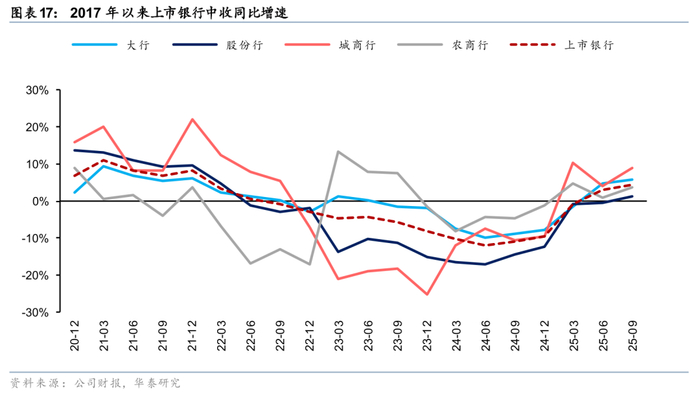 政策呵护下,银行息差逐步企稳改善,驱动核心盈利能力修复。今年以来,监管部门在保持支持性货币政策基调的同时,更加注重维护银行的合理息差水平。如3月底叫停消费贷无序低价竞争、5月非对称降息落地(LPR下调10bp,定期存款利率下调15-25bp),8月推出“换位定向降息”(即由财政出资对消费贷、经营贷利息进行补贴,而非直接下调贷款利率)。叠加负债端成本优化持续显效,上市银行息差降幅趋于收敛,驱动利息净收入改善。上市银行9M25利息净收入同比降幅收窄至-0.6%(vs25H1-1.3%),其中城商行展示出更强的弹性,9M25利息净收入同比+10.3%(vs25H1+8.8%)。