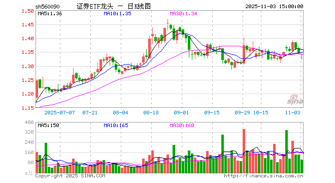 11月3日,证券ETF龙头(560090)跌0.30%,成交额1.38亿元。当日份额增加2100.00万份,最新份额为27.82亿份,近20个交易日份额增加1.56亿份。最新资产净值计算值为37.30亿元。