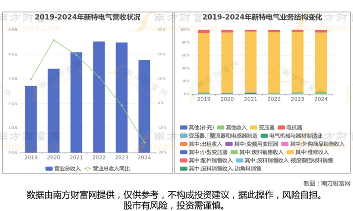 数据显示(如上图),新特电气2024年营业收入为3.77亿,同比增长-15.88%,近5年复合年增长率2.57%。