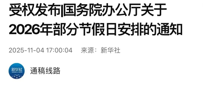 1月4日,国务院办公厅关于2026年部分节假日安排的通知发布。