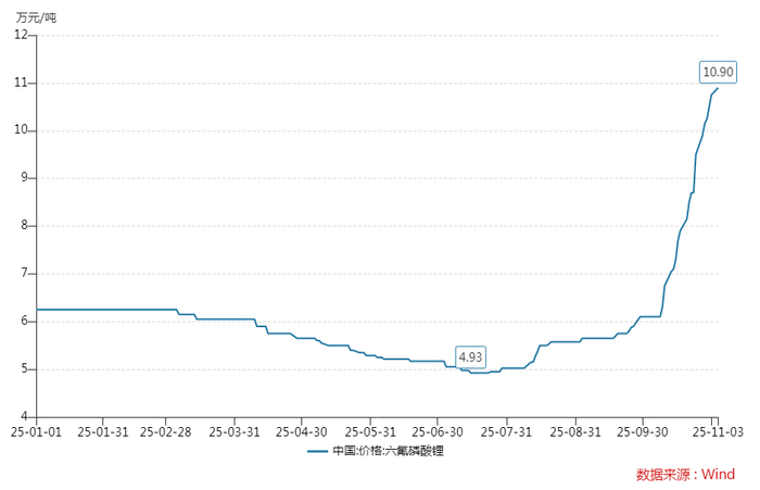 202510月底,六氟磷酸锂市场报价超过10万元/吨,最高价格达到11万元/吨,较10月初累积上涨超过82%,较2025年最低价格累积上涨超过120%。在短短一个月内,六氟磷酸锂再次出现暴涨行情。
