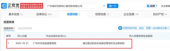 近日,新经济观察团发现,广州海印互联网小额贷款有限公司(下称“海印小贷”)被广州市市场监督管理局列入经营异常名录,时间为2025年10月21日,原因是“通过登记的住所或者经营场所无法联系的”。