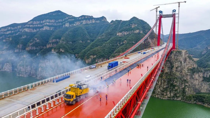 济新高速黄河三峡大桥是济(源)新(安)高速公路的控制性工程,位于黄河小浪底库区,全长1688.5米,是世界首座独塔单跨地锚式回转缆悬索桥。目前,大桥已进入桥面沥青摊铺阶段,全力冲刺年底通车目标。