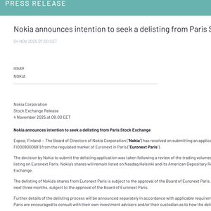 公告指出,诺基亚决定提交退市申请,是基于对在泛欧交易所上市相关的交易量、成本及行政要求的综合评估。