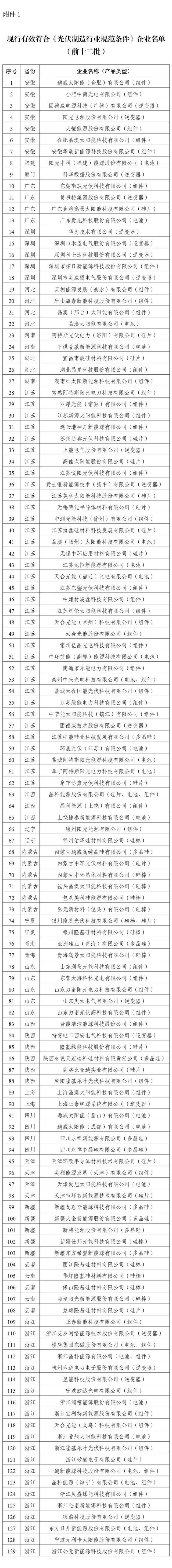 根据《光伏制造行业规范条件(2024年本)》及《光伏制造行业规范公告管理办法(2024年本)》的规定,经企业提交自查报告、地方审核、专家评审、现场核实、地方复核、网上公示等程序,现将现行有效符合《光伏制造行业规范条件》企业名单(前十二批)、光伏制造行业规范企业变更公告信息予以公告。