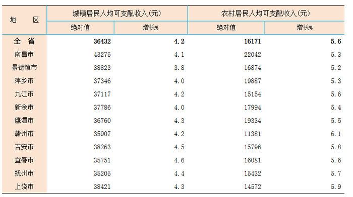 按常住地分,城镇居民人均可支配收入36432元,同比增长4.2%(南昌以43275元领跑全省,抚州增速最快);农村居民人均可支配收入16171元,同比增长5.6%(南昌以22042元领跑全省,赣州增速最快)。农村居民人均可支配收入增速快于城镇居民1.4个百分点。
