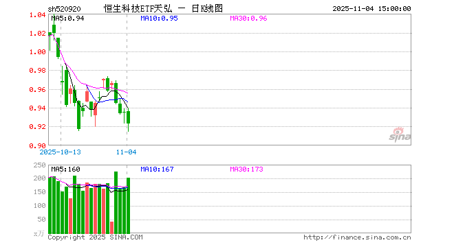 11月4日恒生科技ETF天弘(520920)份额增加2.00亿份,最新份额50.19亿份,最新规模45.72亿元