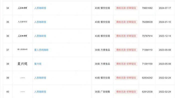 企查查数据显示,要潮文化的咖啡店名起初为“THE PEOPLE”,自2022年起先后多次申请“人民咖啡馆”商标,均被驳回,目前仅持有“潮人民咖啡馆”“要潮人民咖啡馆”两个注册商标。但记者查询其多家直营店门面图片发现,并没有“潮”和“要潮”的字样展示出来,各门店均为“人民咖啡馆”样式的招牌。