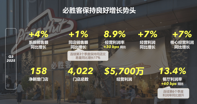 整体来看,第三季度百胜中国门店扩张加速,净新增门店536家,前九个月净新增门店1119家,其中净新增加盟店占比分别为32%和29%。截至2025年9月30日,门店总数达17514家,其中肯德基门店总数达12640家,必胜客门店总数达4022家。其中,第三季度肯德基净新增门店创历史同期新高,加盟店净新增163家,占比41%。