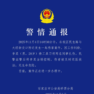 11月5日,石家庄市公安局桥西分局发布警情通报:2025年11月4日14时30分许,该区民生路与大经街交口附近发生一起伤害案件。因工作纠纷,李某(男,28岁)持工具刀将两名同事扎伤。民警出警后将李某当场控制,伤者被及时送医救治,无生命危险。目前,案件正在进一步办理中。