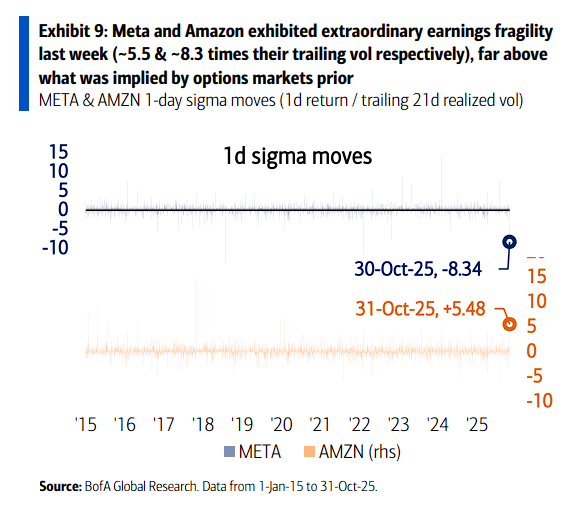 Meta在10月30日股价暴跌11.3%,其单日波幅是其过往已实现波动率的约8.3倍。