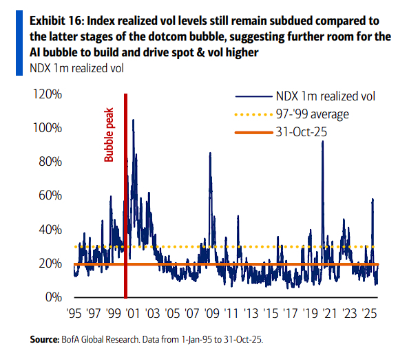 “尽管股价与波动率同涨历来是市场泡沫的标志……但目前指数的已实现波动率水平仍然温和(尤其是与科网泡沫时期相比),这表明在最终破裂前,股价和波动率可能还有进一步的上行空间。这与我们更广泛的泡沫框架分析一致。”