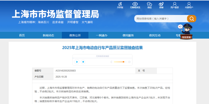 2025年上海市电动自行车产品质量监督抽查结果公布