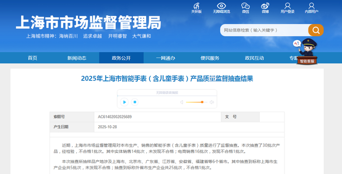 2025年上海市智能手表(含儿童手表)产品质量监督抽查结果发布