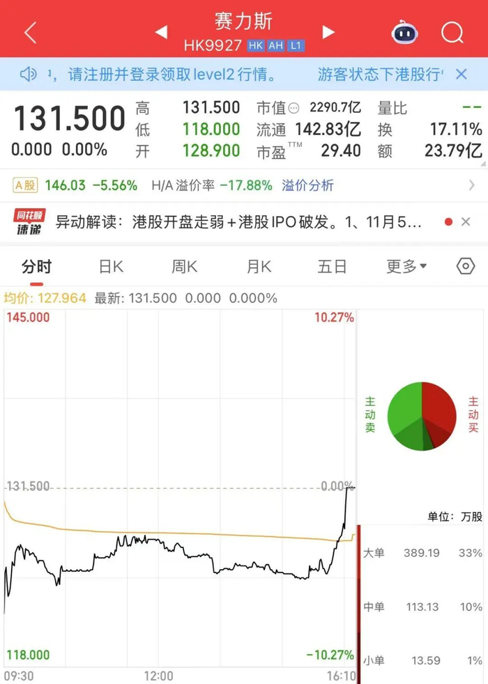 具体来看,正式交易之前,赛力斯港股股价略有起伏,最终以128.9港元(约合人民币118.20元)开始交易,较131.5港元(约合人民币120.59元)的定价略有下跌。开始交易后继续下跌,盘中跌幅一度超过10%。截至收盘,报131.5港元/股,与发行价持平。
