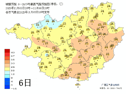 6日晚上到7日白天,桂南有小雨、局地中雨,桂北阴天到多云有分散小雨。