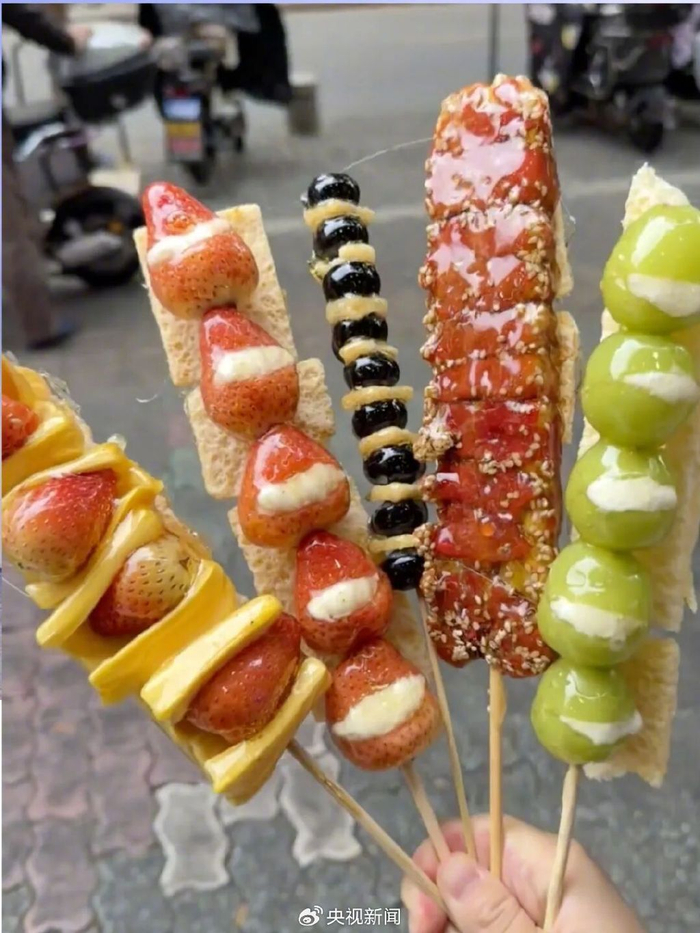 所谓奶皮子糖葫芦,比较常见的,是在传统糖葫芦外面贴一层奶皮子。也有把山楂剖成两半,将一小块奶皮子包在中间,最后裹糖浆的“夹心版”。还有更创新的版本,把山楂换成阳光玫瑰、草莓,甚至无花果、菠萝蜜、榴莲,中间填上酸奶,最后再贴一层奶皮子……几乎集齐所有网红食材。
