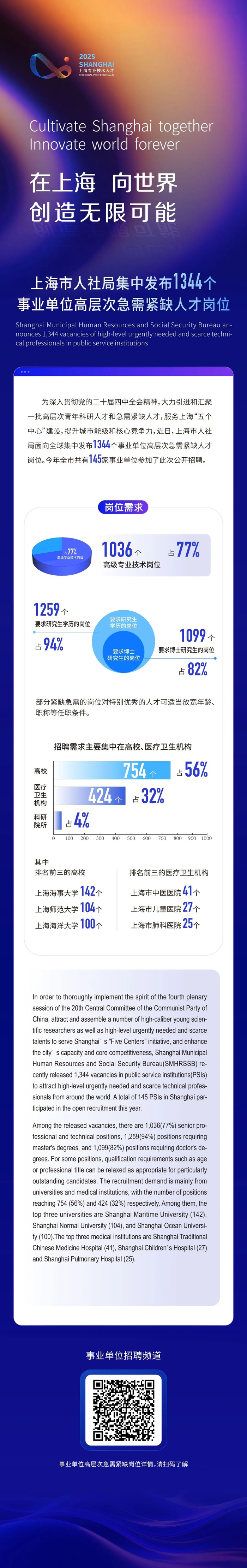 市人社局介绍,本市部分事业单位面向全球公开招聘一批高层次急需紧缺专业技术人才,共计1344个岗位,涉及全市145家事业单位,招聘需求集中在高校、医疗卫生机构等。详见↓