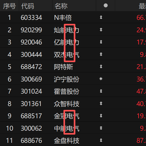 电力设备概念股集体爆发,包括双杰电气、特变电工、保变电气、太阳电缆在内共计十余股涨停。纵观今日涨幅榜,多只证券简称中含有“电”字的个股位居前列。
