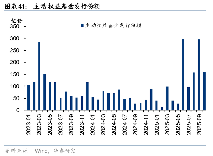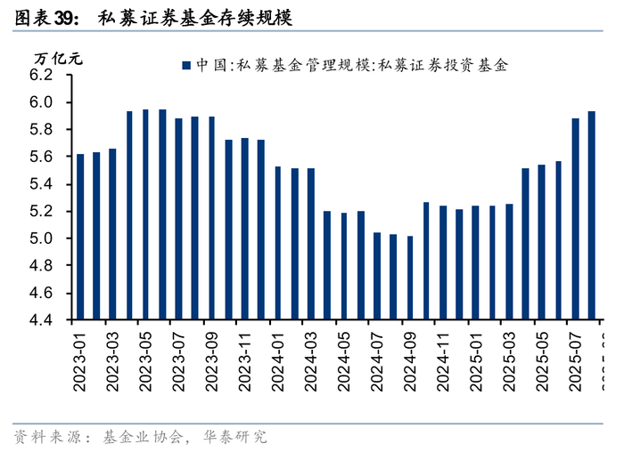 权益类产品收益亮眼,私募、公募代销回暖,投顾业务探索纳入ETF。年初以来私募产品收益率表现亮眼,据私募排排网统计,前三季度量化多头和主观多头产品收益率分别为35.76%和32.15%。亮眼的业绩驱动私募产品备案热度持续提升,今年1-9月私募证券基金备案规模合计3431亿元,同比大幅增长234%,其中7月单月备案规模接近800亿元。截至9月末,私募证券基金存续规模已达5.97万亿元,较年初提升14%。公募方面,年初至10月末Wind股票型基金指数涨29.69%,基金新发份额稳步修复。1-10月主动权益基金和被动权益基金分别发行1221亿份、3526亿份,同比+118%、+220%。同时,2025年6月证监会发布的《关于在科创板设置科创成长层 增强制度包容性适应性的意见》提出“将科创板ETF纳入基金投顾配置范围”,预计投顾业务底层资产将进一步扩大至ETF。