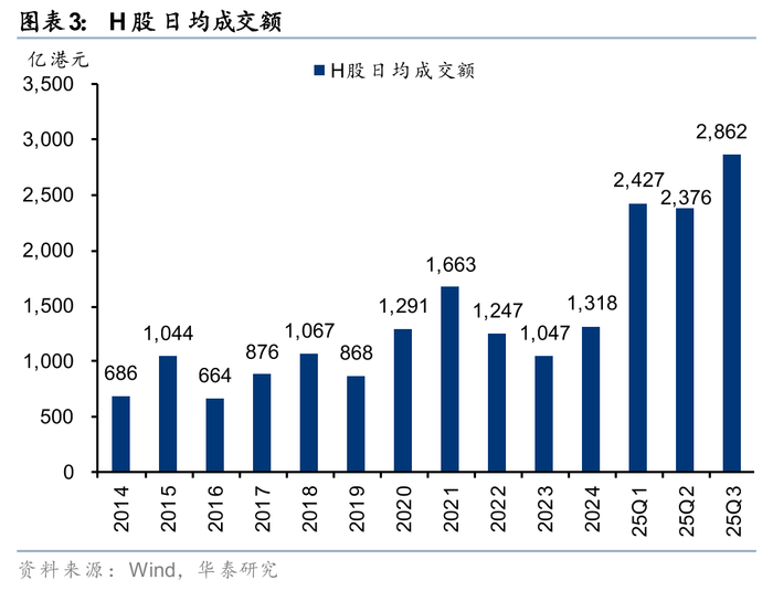 权益市场趋势向上,成交、两融高位运行。年初以来权益市场景气度持续提升,前三季度上证、恒指、恒生科技累计上涨15.8%、33.9%、44.7%。市场热度提升驱动股票交易活跃,2025年前三季度日均成交额为16496亿元,同比+107%,创历史年度日均新高。25Q3 A股日均成交额超2万亿,较24Q3增长211%。杠杆资金持续入市,A股融资余额连创历史新高,2025年前三季度日均余额19,322亿元,同比+32%;25Q3单季度日均余额21,050亿元,同比+50%。同时,港股成交活跃度进一步抬升,2025年前三季度日均成交额2,563亿港元,同比增长52%;25Q3日均成交额2862亿港元,较24Q3增长141%。