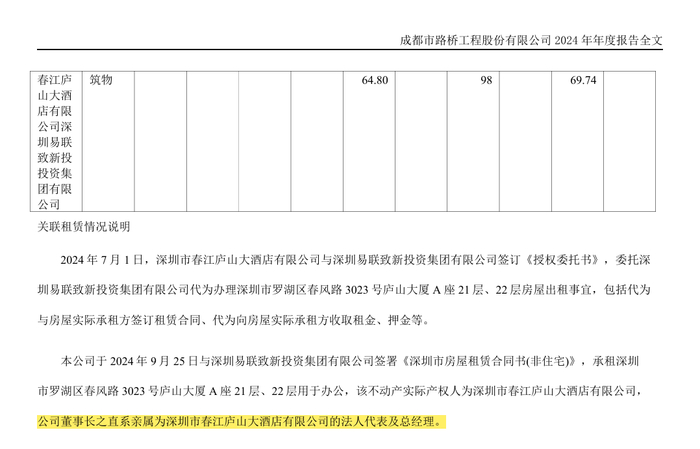 本公司于2024年9月25日与深圳易联致新投资集团有限公司签署《深圳市房屋租赁合同书(非住宅)》,承租深圳市罗湖区春风路3023号庐山大厦A座21层、22层用于办公,该不动产实际产权人为深圳市春江庐山大酒店有限公司,公司董事长之直系亲属为深圳市春江庐山大酒店有限公司的法人代表及总经理。