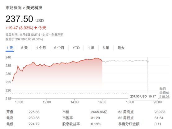 截至周三收盘,美光股价飙升近9%,报237.5美元,盘中升至239.88美元的历史高位。