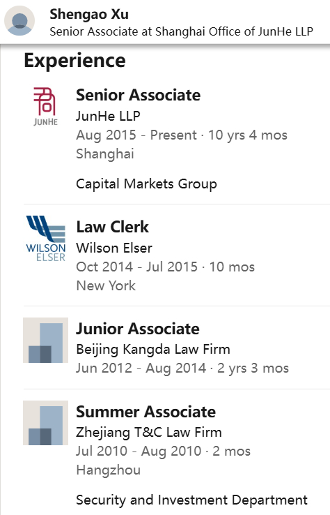 据领英信息,许晟骜2008年至2012年就读于浙江理工大学法学专业,随后赴美国福特汉姆大学攻读法学硕士,具备中国律师资格和美国纽约州律师资格。