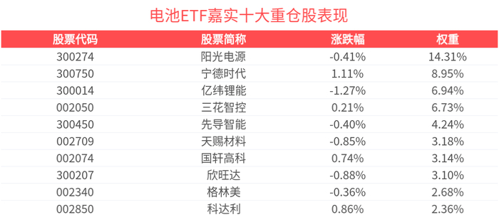 数据显示,截至2025年10月31日,中证电池主题指数前十大权重股分别为阳光电源、宁德时代、三花智控、亿纬锂能、先导智能、天赐材料、欣旺达、国轩高科、格林美、科达利,前十大权重股合计占比56.8%。