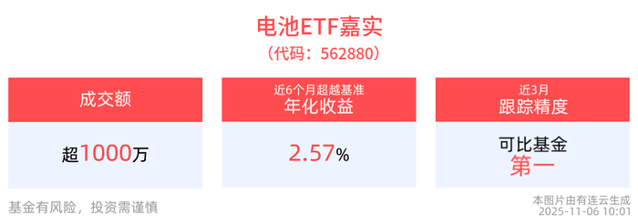 截至11月5日,电池ETF嘉实近3年净值上涨3.80%。从收益能力看,截至2025年11月5日,电池ETF嘉实自成立以来,最高单月回报为39.76%,最长连涨月数为6个月,最长连涨涨幅为90.20%,上涨月份平均收益率为9.20%。