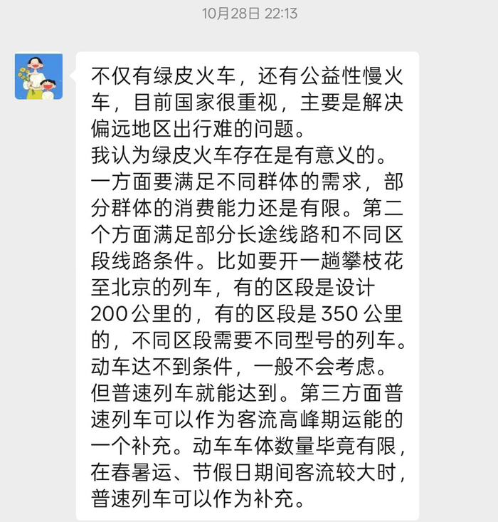 她还认为,还有第三方面,普速列车可以作为客流高峰期运能的一个补充。动车车体数量毕竟有限,在春暑运、节假日期间客流较大时,普速列车可以作为补充。