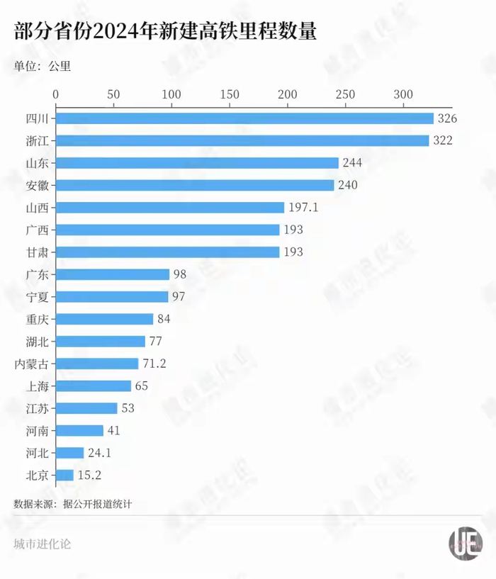 以至于市市通高铁开始成了潮流,光是2024年,全国都有不少地方在新增高铁里程,最多的省份超过了300公里。为什么疯狂建高铁?自然不只是单纯它比绿皮火车快这么简单的。