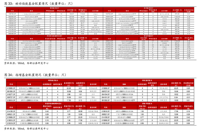 25Q3,被增持较多的主动权益基金为易方达成长动力、博道成长智航、财通资管数字经济等;被动型基金中持仓规模前三为易方达创业板ETF、鹏华中证酒ETF、富国中证港股通互联网ETF;指增基金被持有数居前的为国泰海通中证1000指增、招商中证500等权重指增、招商中证1000指增等;固收+基金被增持较多的为华泰保兴尊合、景顺长城景颐丰利、永赢稳健增强等;纯债基金被增持数前三为鹏扬中债-30年期国债ETF、博时上证30年期国债ETF、海富通中证短融ETF;商品型基金增持数量居前为华安黄金ETF、博时黄金ETF、广发上海金ETF、大成有色金属期货ETF。