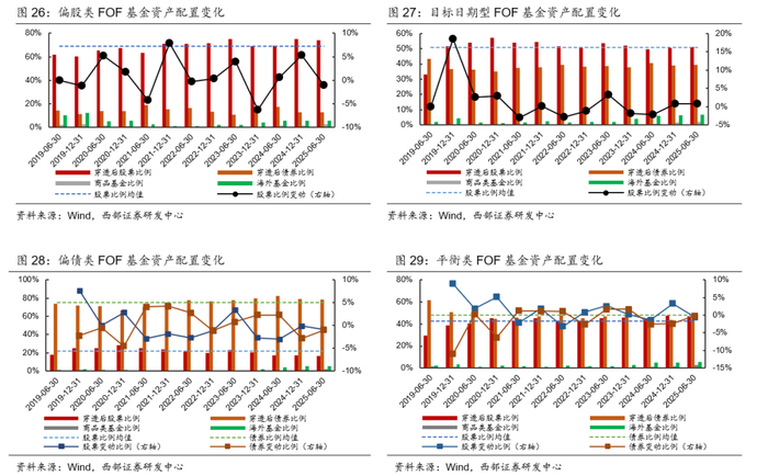 仅目标日期FOF仓位提高。25H1穿透持仓后,偏股类FOF、目标日期类FOF、偏债类FOF、平衡类FOF股票仓位分别为73.94%、51.19%、16.56%、46.91%,相对24H2变动分别为:-1.03pct、+0.72pct、-0.92pct、-0.57pct。19H1-25H1共13个报告期,偏股类FOF、目标日期类FOF、偏债类FOF、平衡类FOF股票仓位均值分别为68.87%、51.00%、21.69%、42.83%,可见在25H1偏债类FOF股票仓位在区间均值之下,其余3类FOF基金股票仓位均在区间均值之上。
