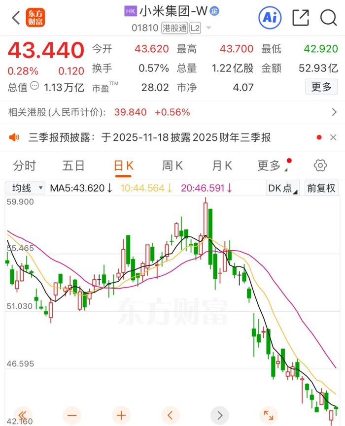 小米将于11月18日公布季度财报。过去几个月时间,小米股价持续受压,截至目前,离最高位回调已近30%。
