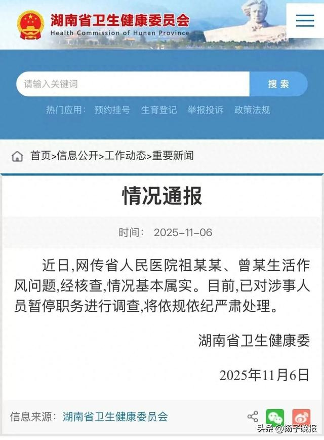11月6日,湖南省卫健委发布情况通报:近日,网传省人民医院祖某某、曾某生活作风问题,经核查,情况基本属实。目前,已对涉事人员暂停职务进行调查,将依规依纪严肃处理。