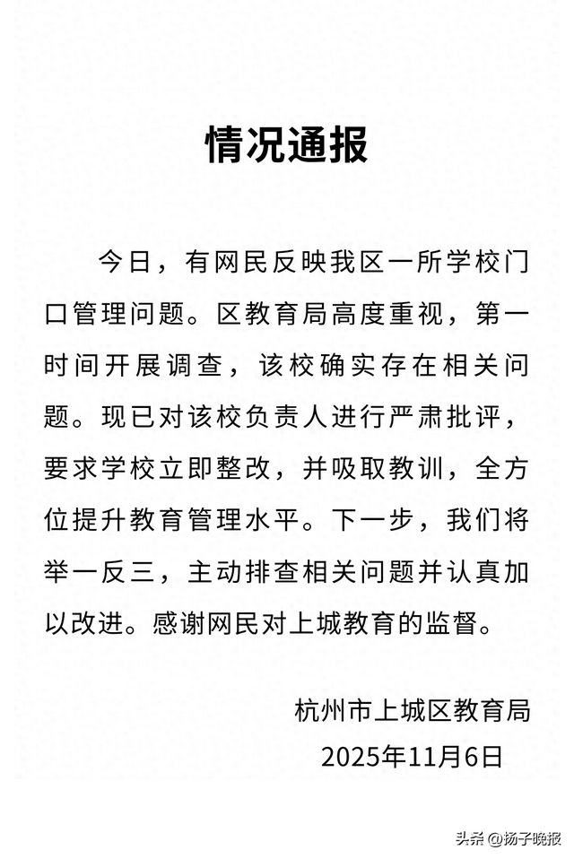 今日,有网民反映我区一所学校门口管理问题。区教育局高度重视,第一时间开展调查,该校确实存在相关问题。现已对该校负责人进行严肃批评,要求学校立即整改,并吸取教训,全方位提升教育管理水平。下一步,我们将举一反三,主动排查相关问题并认真加以改进。感谢网民对上城教育的监督。
