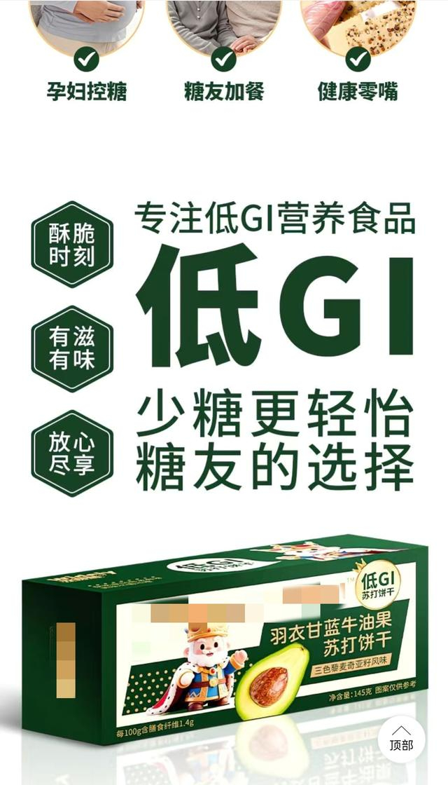 “孕妇控糖、糖友加餐、健康零嘴”……在电商平台上,各类低GI食品也正火热销售。以一款羽衣甘蓝牛油果苏打饼干为例,包装盒右上角打出“低GI苏打饼干”的标志,产品详情中也强调“少糖更轻怡、糖友的选择”,但当记者询问是否有关于低GI食品的检测报告时,客服发来的却只有关于总糖、能量、蛋白质、脂肪、碳水化合物等8项的检测报告,其中并不包含与低GI有关的内容。面对记者的询问,另一家同类店铺的客服,则仅发来包装盒信息,称“您参考一下成分配料表”。