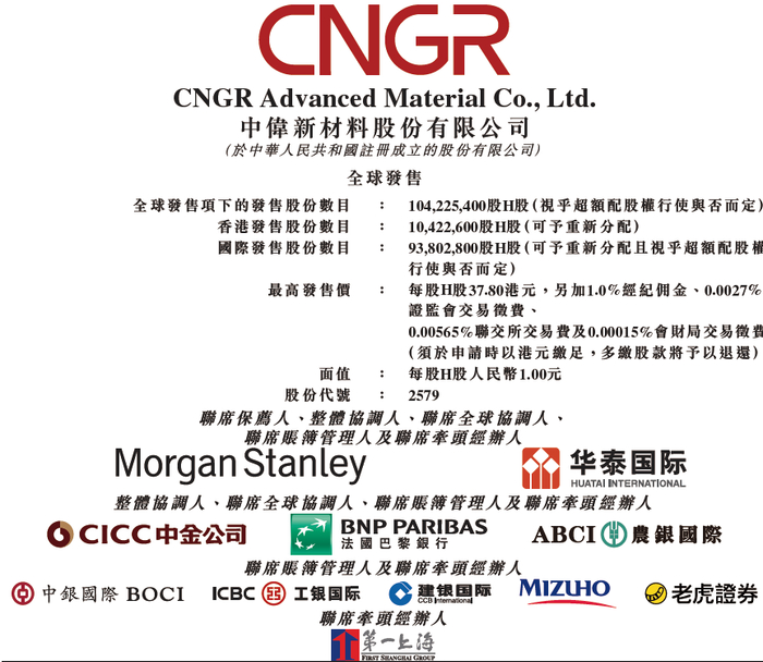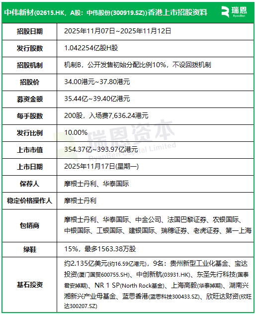 来自贵州铜仁的A股上市公司中伟新材02579.HK,A股简称中伟股份(300919.SZ))于今日(11月7日)起至下周三(11月12日)招股,预计2025年11月17日在港交所挂牌上市,摩根士丹利、华泰国际联席保荐。