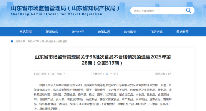 山东省市场监督管理局关于36批次食品不合格情况的通告2025年第28期(总第519期)