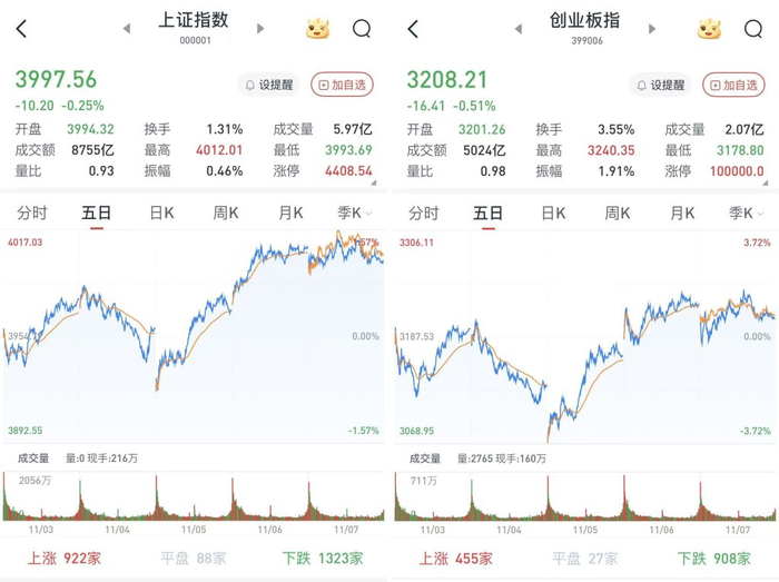 A股三大股指11月7日集体低开,沪指直接跌破4000点关口。早盘两市回暖,三大股指午前一度均转涨。午后短暂冲高后回落,最终小幅低收。