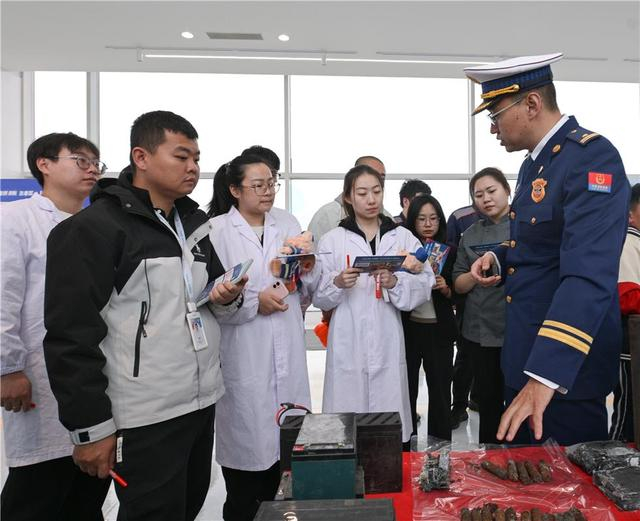 消防员向市民介绍电池燃爆的风险隐患。